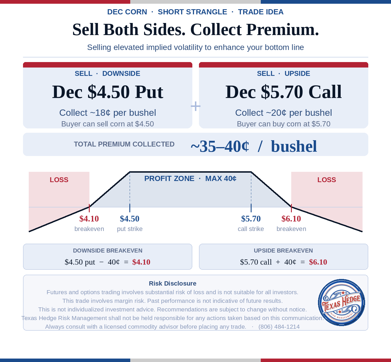 If you have unpriced bushels in the bin or new crop in the field, this trade lets you collect 38–40¢ per bushel today — while keeping your corn unpriced and waiting to see how the market develops. If corn stays between $4.50 and $5.70 by December expiration, you pocket the full premium. Think of it as adding 40 cents to whatever price you ultimately sell your corn for.