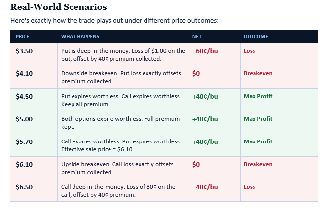 If corn runs past $5.70, you've given up some upside — but you're still receiving $6.10 effective before the call costs you anything. If corn crashes below $4.10, the put starts working against you, but you still have a partial floor near $4.50 on that portion of bushels.