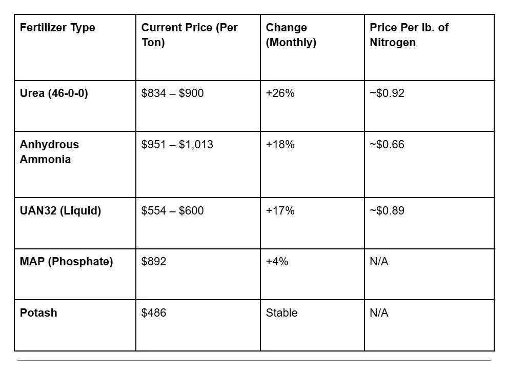 The following prices represent the sharp "post-conflict" spike. Nitrogen products, which rely heavily on natural gas and international shipping, are seeing the most aggressive jumps.