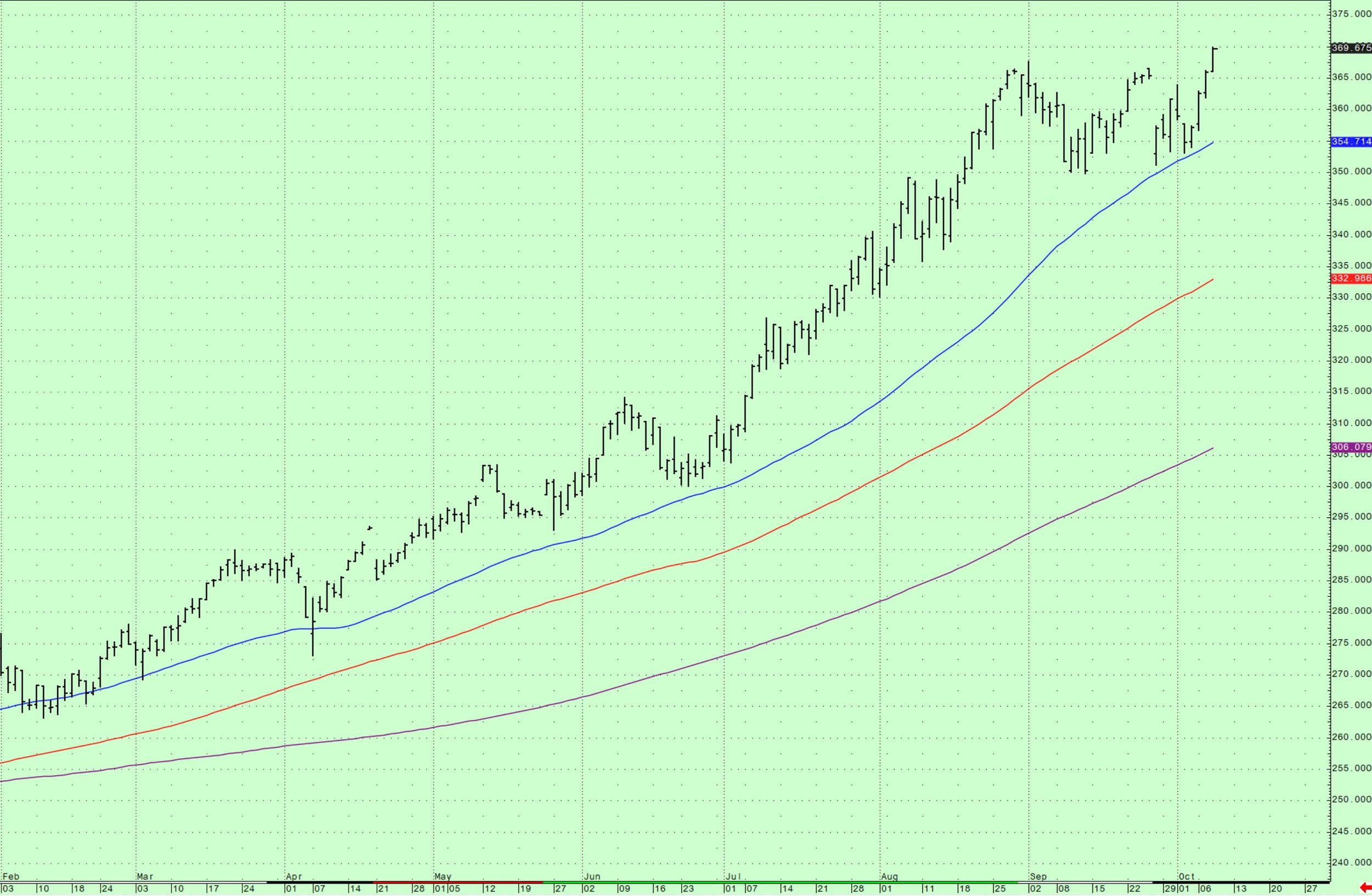 On Aug 27, Sept feeders printed 370.00. That's the current high today in Oct feeders. The Average Daily Continuation chart in CQG (which is THE industry standard for price data) shows a high of 369.37. One thing for certain is that these prices are as of 10:30 CST this morning and by 11:35 things will be different.